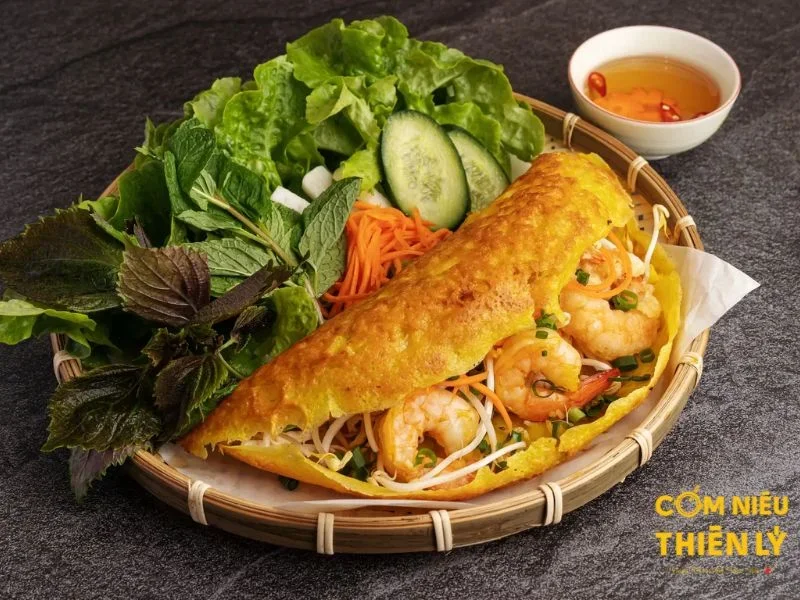 Banh Xeo is a crispy, savory pancake made from rice flour and coconut milk, filled with ingredients such as pork, shrimp, and bean sprouts. The name 'banh xeo' mimics the sizzling sound it makes when the batter hits the hot skillet. This dish is particularly popular in the South and is served with fresh lettuce and herbs for wrapping and dipping.
