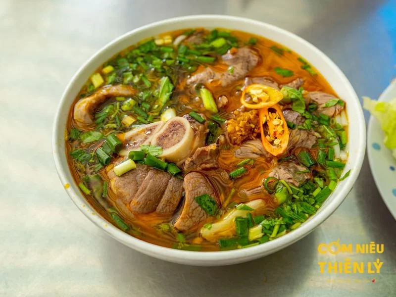 Bun Bo Hue is a spicy and robust noodle soup from Hue, known for its lemongrass-flavored broth and the inclusion of both beef and pork. The deep flavors and the heat from the chili oil make it a memorable dish for those who love a bit of spice.