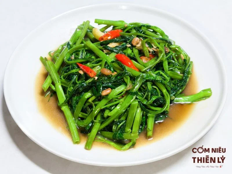 Rau Muong, or water spinach, is frequently stir-fried with garlic and is one of the most popular vegetable dishes in Vietnam. Its popularity stems from its versatility and nutritional value, often enjoyed as a side dish with richer meals.